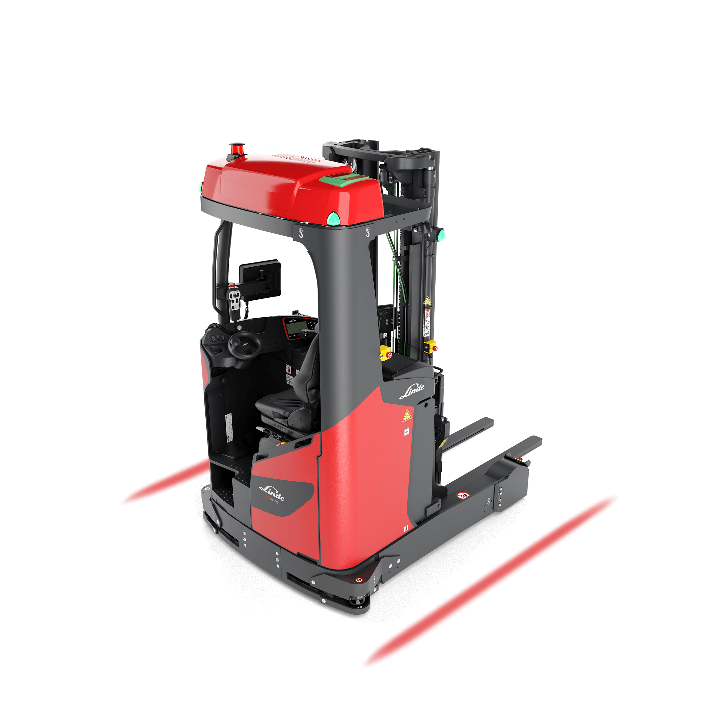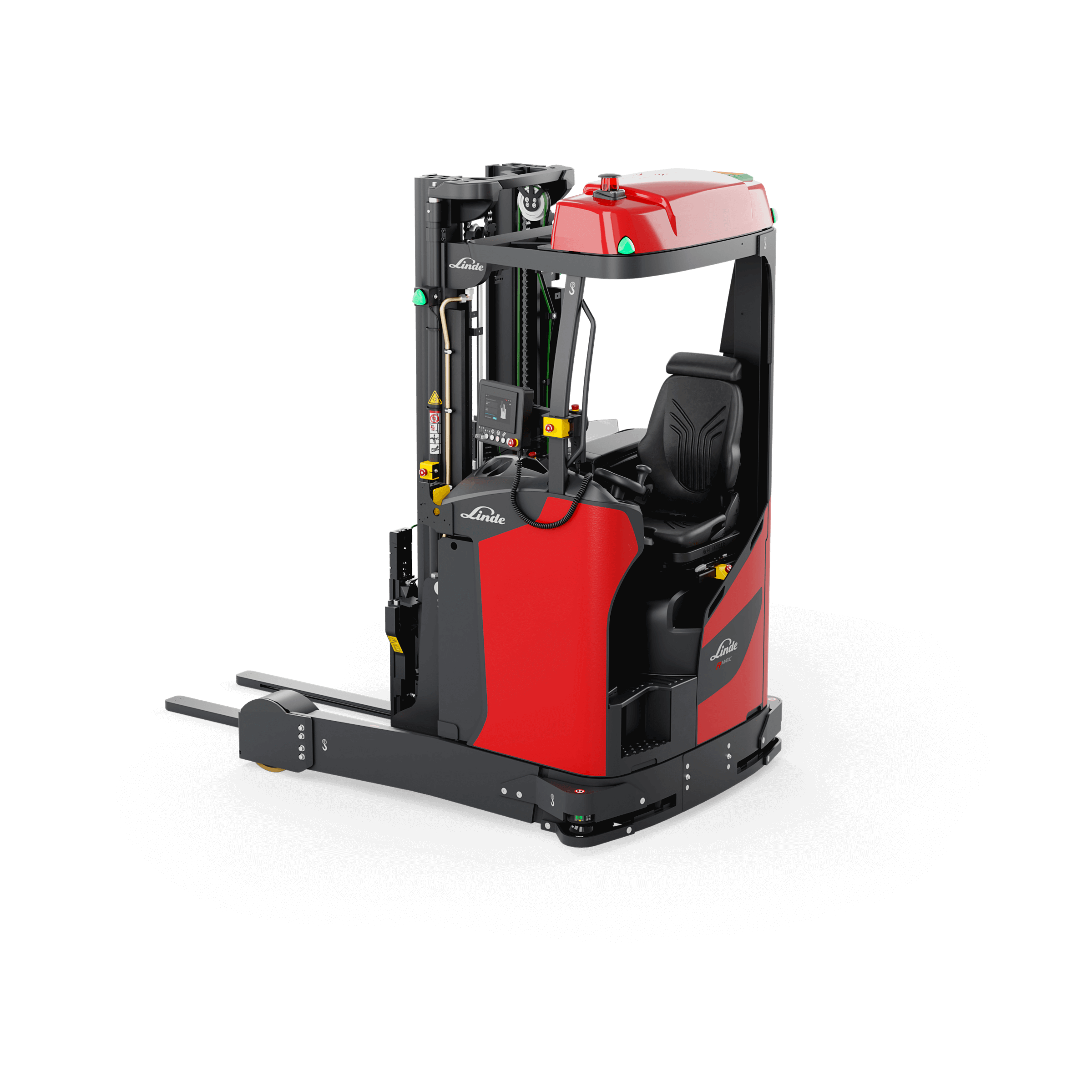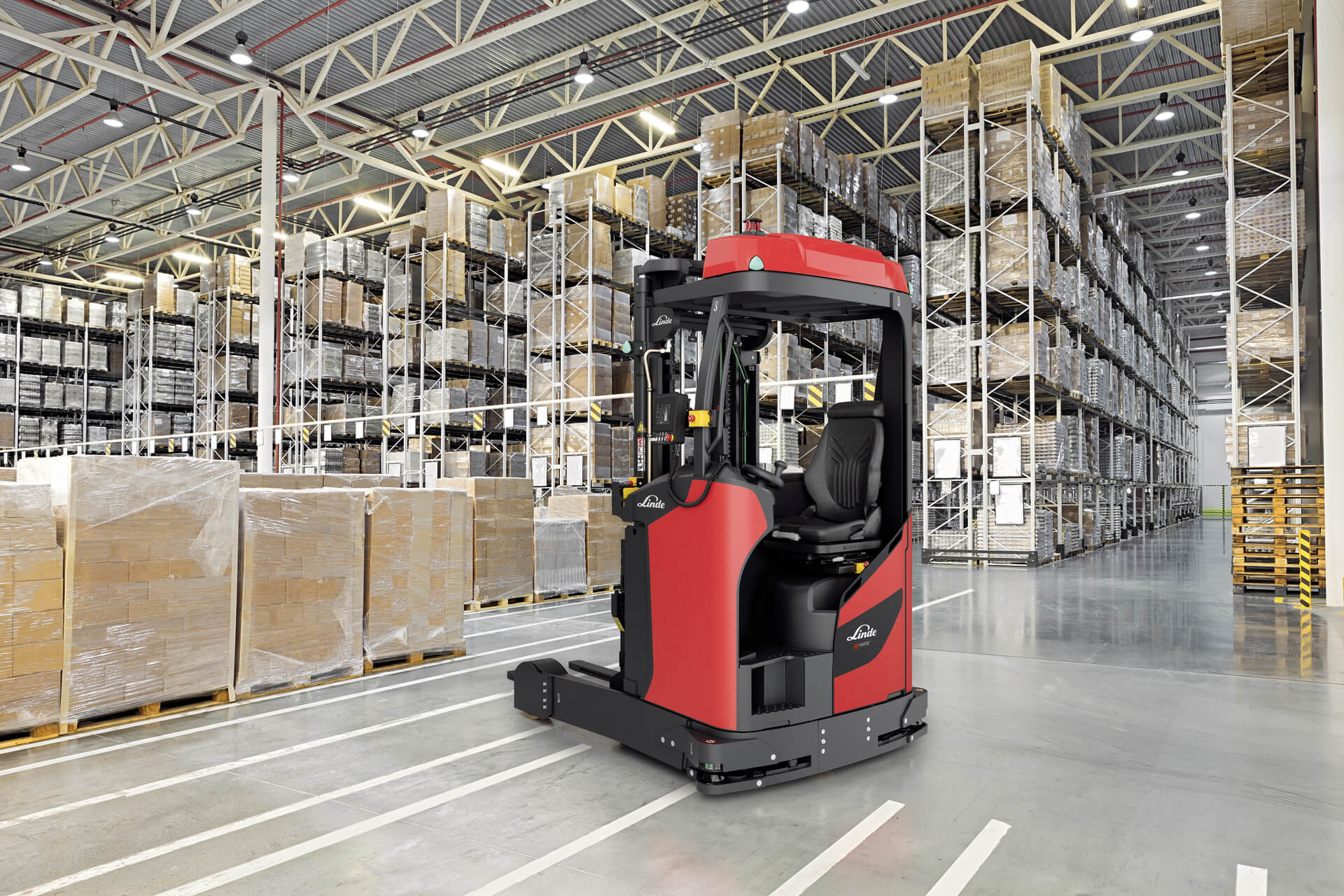 De Linde R-MATIC k autonome reachtruck is geschikt voor het transport van goederen tot 2,3 ton. Hij kan deze wegzetten of oppikken tot 10 meter hoog.